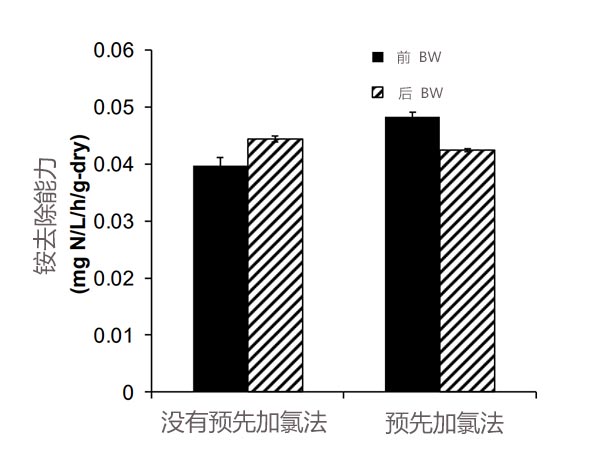 圖2顯示了反洗前后活性炭的銨去除能力的變化。沒有預(yù)氯化,銨去除能力為0.040mgN/L/h/g-dry。在第一次取樣后反洗(p<0.01)后,它增加了12%。另一方面,當(dāng)實施預(yù)氯化時,去洗后的去除能力降低了12%(從0.048到0.042mg N/L/h/g-dry)(p<0.01)。