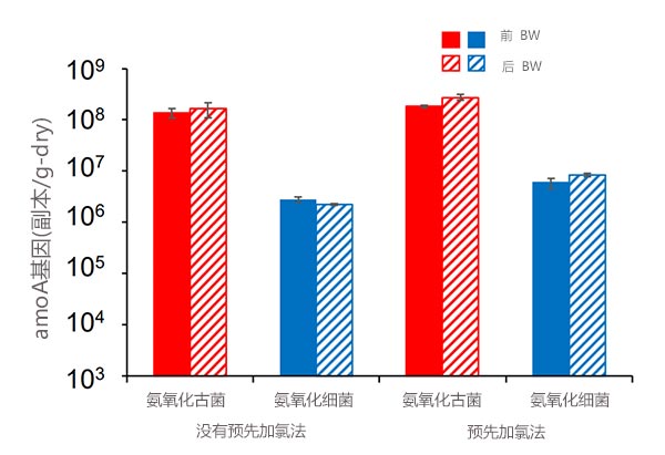 圖3:在“無預(yù)氯化”和“預(yù)氯化”的采樣時間之前(實心棒)和之后(帶斜線的棒)反洗的活性炭上AOA和AOB的豐度。