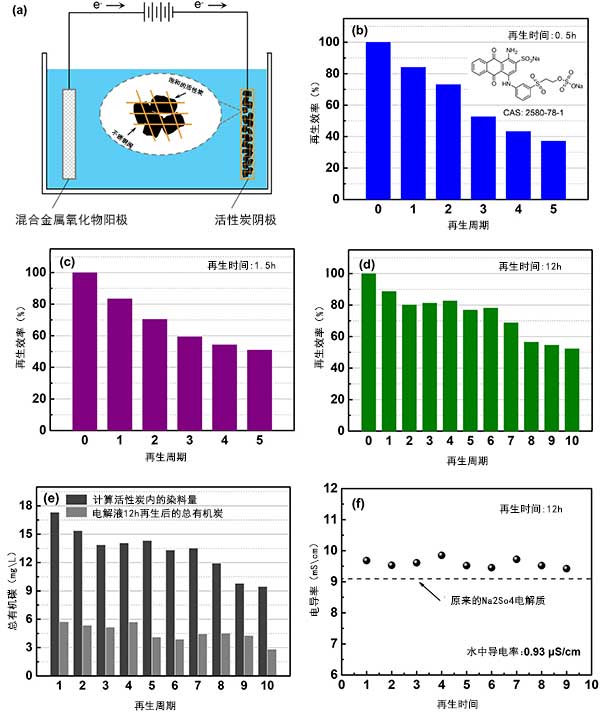 圖1。再生時(shí)間對(duì)RE和總有機(jī)碳(TOC)去除的影響。(a)設(shè)置示意圖。(b)-(d)當(dāng)再生時(shí)間分別為0.5小時(shí)(b),1.5小時(shí)(c)和12小時(shí)(d)時(shí),RE的變化。(e)再生12小時(shí)后的電解質(zhì)TOC,并計(jì)算吸附在活性炭上的RB19的TOC。(f)12小時(shí)后電解質(zhì)的電導(dǎo)率超過(guò)10次再生。