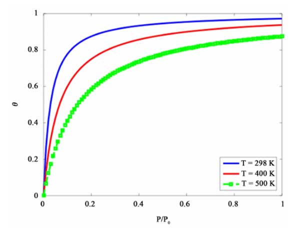 下圖(圖1)顯示了加載分?jǐn)?shù)θ與氣體壓力P/P0在不同溫度之間的定量關(guān)系。BET方程是模擬活性炭上氣體吸附動力學(xué)的好方法,但它僅適用用于單組分氣體吸附。在下面的部分中,介紹了多組分油蒸氣回收的綜合模型。