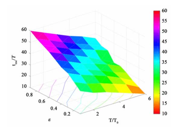 所有參數(shù)空間在孔隙度和溫度方面的綜合研究如圖4所示。我們可以看到,較高的孔隙率和較低的溫度將導(dǎo)致反應(yīng)器中吸附物的停留時間更長。較高的溫度會導(dǎo)致更快的吸附速率,但會降低活性炭吸附劑的吸附能力。