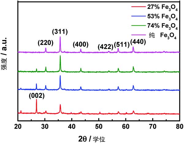 使用XRD衍射儀測(cè)量活性炭復(fù)合物的晶體結(jié)構(gòu)。圖1顯示了所制備樣品的衍射圖案。在2的特征衍射峰θ= 31.24°,36.82°,44.76°,55.62°,59.30°和65.19°的與(220),(311),(400),(422),(511)和(440)Fe 3 O 4平面一致。此外,在約2峰值θ=26.20°被分配給蓬松結(jié)構(gòu)化活性炭。觀察到Fe 3 O 4衍射峰的強(qiáng)度隨著Fe 3 O 4納米顆粒負(fù)載量的增加而增強(qiáng),并且活性炭的強(qiáng)度在相同的過程中減少。上述現(xiàn)象表明Fe 3 O 4納米顆?梢猿晒Φ匾肱钏山Y(jié)構(gòu)的活性炭上。