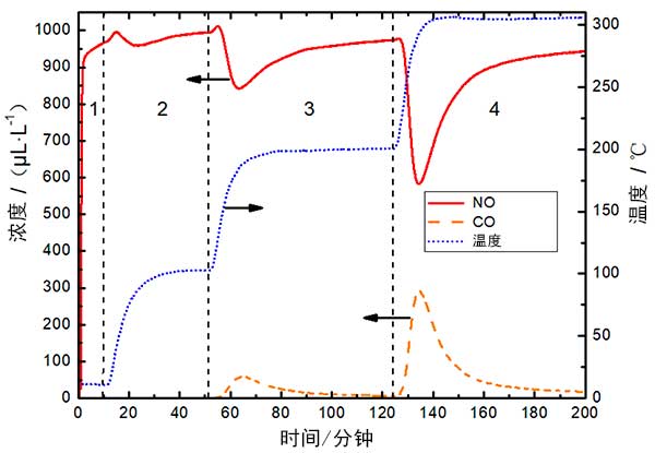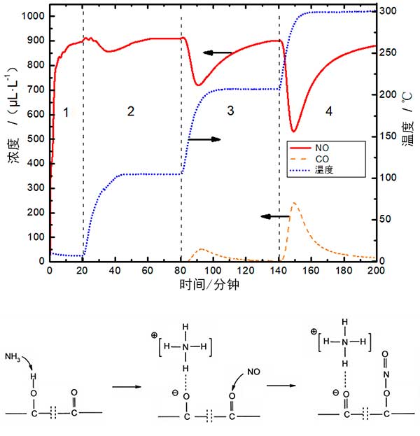 當(dāng)溫度低于300℃時(shí),作為還原劑的活性炭的脫硝能力差。為了進(jìn)一步提高活性炭的脫硝能力,NH 3通常加入作為還原劑。如圖3所示,當(dāng)入口氣體為1000μL/ L NO +1000μL/ L NH 3時(shí),研究了活性炭在不同溫度下的脫硝能力。本文使用的煤質(zhì)活性炭是酸性的,含酚羥基的官能團(tuán)相對(duì)較高,促進(jìn)了脫硝。它可以從之間的比較可以看出圖2和圖3中,加入NH后的趨勢(shì)和CO的濃度3基本上相同,而不NH 3,表明NH 3對(duì)含氧官能團(tuán)的分解沒(méi)有效果。
