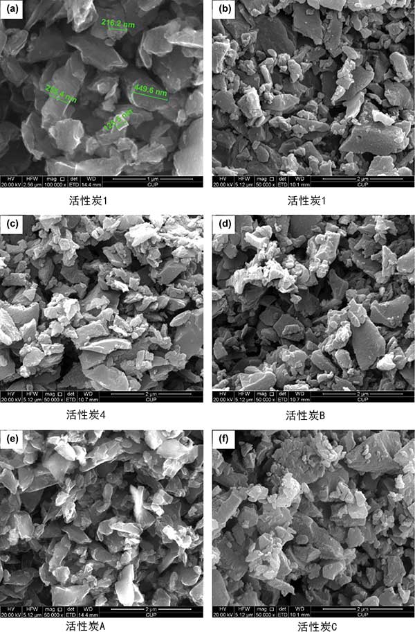為了研究活性炭結構對氣體混合物的分離性能的影響,七種活性炭,即活性炭1、2、3、4和活性炭A、B、C。評估了SEM圖像及其顆粒分布示于圖2和3中。對比了活性炭的比表面積,微孔體積,孔徑,中值粒徑和骨架密度等。在這些活性炭中,1234衍生自相同類型的活性炭,并具有相同的比表面積,微孔體積,孔徑和骨架密度,但具有不同的粒徑。這類活性炭的中值粒徑分別為1.14、1.41、2.07和6.18μm。在活性炭中,粒徑?jīng)Q定了微孔的利用率,孔徑控制了氣體分子進入活性炭孔隙的可能性,比表面積和孔隙體積決定了存儲容量。這種孔徑和粒徑比較適合分離氣體混合物,但是,對于孔體積或比表面積,CO 2吸收越大越好。下面我們選擇兩種氣體混合物來評估活性炭結構對分離性能的影響,即兩種碳氫比例不同的混合氣體。將這兩種進料氣體混合物與七種活性炭進行分離實驗。實驗條件溫度和初始壓力分別為10℃和約2.0MPa。