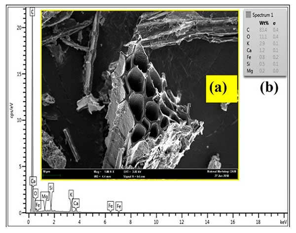 FESEM和EDX如圖2所示。FESEM用于研究活性炭的表面形態(tài)?讖椒植寂c孔隙大小具有相同的附屬關系,如圖2a,b所示。在顯微照片圖像中指出,圓柱狀管構(gòu)成所制備的活性炭的孔結(jié)構(gòu)。由黃麻和椰子纖維制成的活性炭反映了同樣的趨勢。此外,揭示了通過活化劑能在纖維表面上具有良好構(gòu)建和發(fā)展孔隙與高表面積。