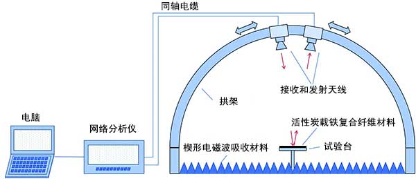 采用拱形法研究了電磁波吸收性能。測試裝置在圖1中示意性地示出。矢量網絡分析儀與接收和發(fā)射天線相連,其中一個具有增強和發(fā)射頻率電磁波的功能,另一個具有接收反射信號的功能。根據反饋信號強度,活性炭載鐵復合纖維材料的尺寸為180×180mm,厚度為2mm。