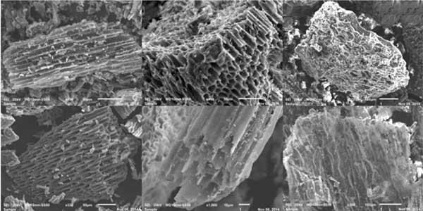 圖1:不同生物質(zhì)材料制成的活性炭掃描電子顯微鏡圖像。