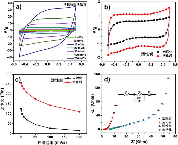 在不同掃描速率下觀察到兩種活性炭的準矩形CV曲線(圖3a),這暗示了非理想的電容行為。我們還觀察到活化后的活性炭的CV環(huán)路較大,這意味著它具有比未活化的活性炭更大的電容(圖3b)。具體電容的總結(jié)如圖3c所示,活化后活性炭獲得的高電容為270,而沒活化的活性炭為125。這種高電容可歸因于諸如高表面積,分級孔徑分布和活性炭的表面潤濕性等因素。對于兩種活性炭,由于電解質(zhì)不足以擴散到電極材料的內(nèi)孔中而觀察到對應(yīng)于掃描速率增加的比電容的降低。