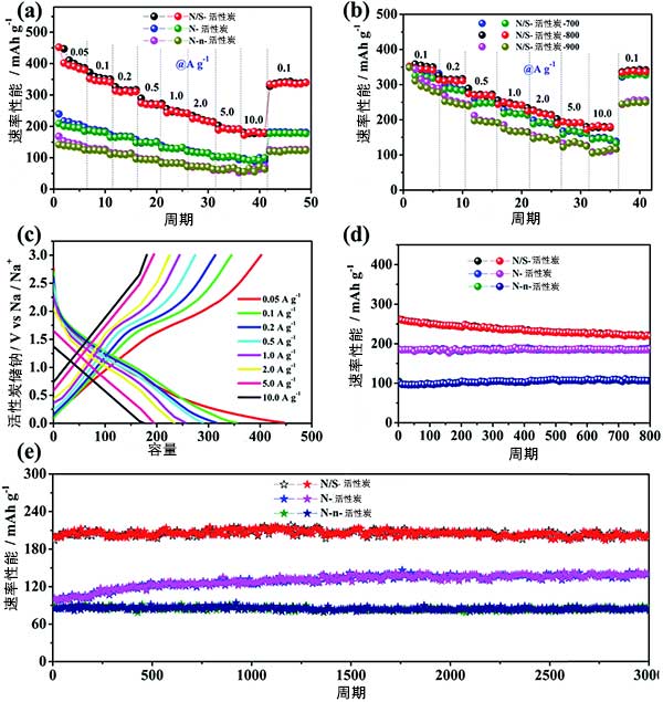 為了進一步描述制成活性炭的電化學(xué)行為,進行循環(huán)伏安法和恒電流充電放電測試。為了證明活性炭的優(yōu)點,還在相同的質(zhì)量負載下測試了幾種活性炭的Na儲存性能,圖2a顯示了在0.05至10Ag-1的不同電流密度下測試5個循環(huán)。與其他兩個樣品相比,氮硫共摻雜活性炭顯示出優(yōu)異的速率性能,在高速測量之后仍然可以恢復(fù)高比容量。對于沒有S摻雜的活性炭,當電流密度增加時,電極提供的容量降低。相比之下,不同電流密度下的恒電流充電放電曲線進一步證實了這些速率的結(jié)果。因此,氮硫共摻雜活性炭電極表現(xiàn)出比其他對照樣品好得多的速率性能和優(yōu)異的鈉儲存性能。