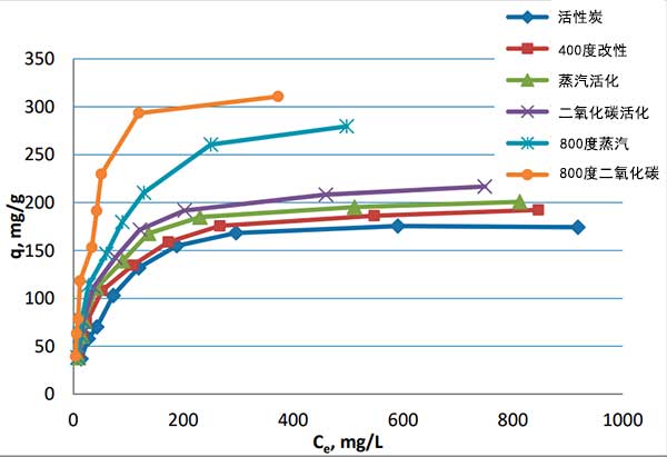 4.對(duì)于氯霉素,活性炭經(jīng)過(guò)一些列改性,具有更高的吸附能力。對(duì)于在800℃下在二氧化碳?xì)夥罩懈男缘幕钚蕴,獲得了較高的單層容量,并且?guī)缀跏俏锤男曰钚蕴康膬杀。?00℃下改性的活性炭的特征在于增加的比表面積,微孔體積和堿性的需氧基團(tuán)數(shù)量的增加。