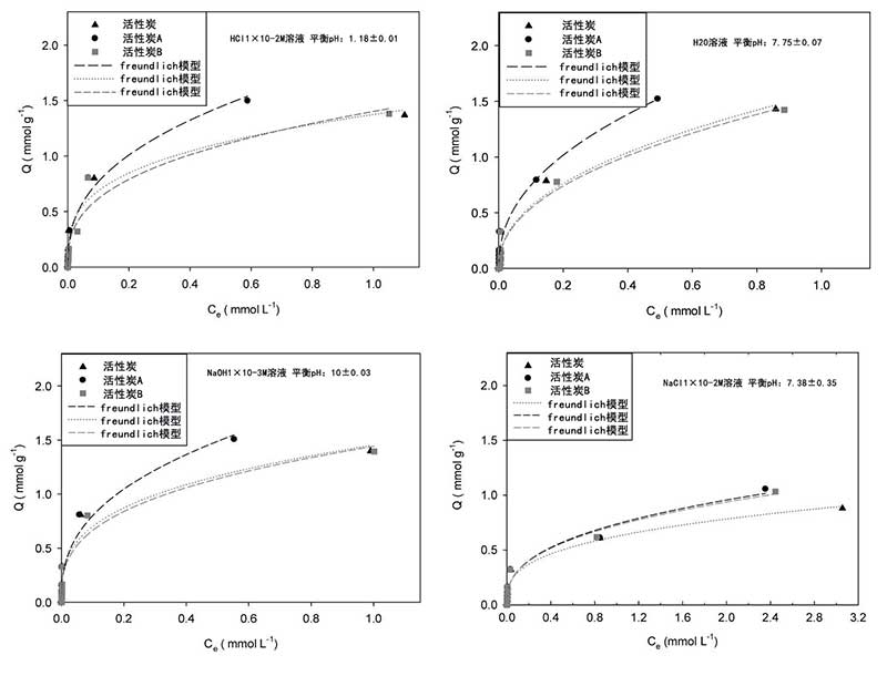從圖3可以看出,在所有測試的實驗條件下,當(dāng)平衡濃度較低(即<0.1mmol L-1)時,對羥基苯甲酸甲酯吸附量的差異三種活性炭最小,而對于較高的平衡濃度,活性炭A表現(xiàn)出最高的性能,活性炭和活性炭B具有相似的行為,除非離子強度發(fā)生變化。事實上,在后一種情況下,熱處理樣品顯示出最佳性能并且?guī)缀跸嗨。為了詳細分析檢索到的結(jié)果,需要進一步調(diào)查,建模分析可能會有所幫助。