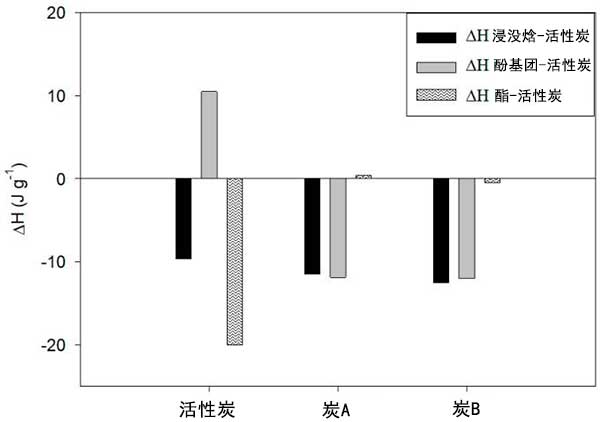為了確定酯基在吸附質(zhì)-吸附劑相互作用中的貢獻,從對羥基苯甲酸甲酯-活性炭和苯酚-活性炭的相互作用焓開始計算相互作用的焓酯-活性炭。對于該計算,假設(shè)焓是分子的加成組成性質(zhì),因此對羥基苯甲酸甲酯-活性炭的相互作用焓對應(yīng)于苯酚和酯與活性炭相互作用焓的總和。圖4中顯示了對羥基苯甲酸甲酯-活性炭,苯酚-活性炭和酯基團在水中吸附物-吸附劑的相互作用中的貢獻。