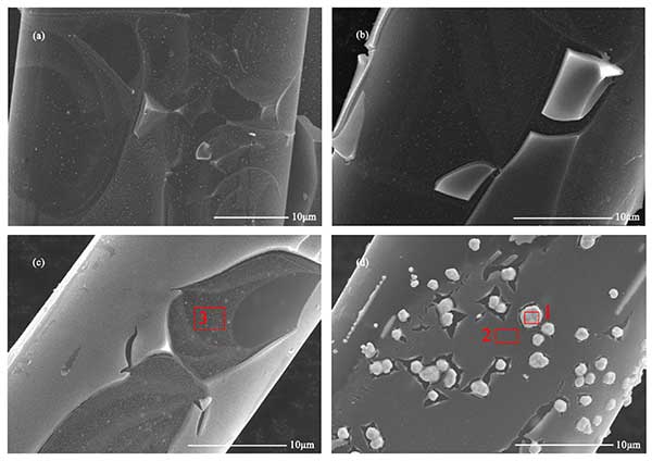 圖1中的FESEM圖像顯示了氧化鈦改性活性炭含銀纖維的表面形態(tài)。在活性炭含銀纖維的表面上觀察到許多納米顆粒,活性炭表面的這些銀納米顆粒被二氧化鈦薄膜包覆,隨著濃度的增加,它們的直徑從約0.2μm急劇增加到1μm。當(dāng)濃度達(dá)到0.4mol/L時(shí),銀納米顆粒不能被二氧化鈦薄膜完全覆蓋。而且,活性炭纖維上的二氧化鈦膜的厚度不均勻。