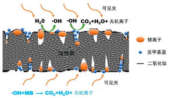 通過光催化降解再生活性炭具有很大的優(yōu)勢,因?yàn)榕c其他再生工藝如熱和化學(xué)處理,微生物再生,電化學(xué)方法和超臨界萃取相比,它具有成本低,二次污染少的特點(diǎn)。此外,光催化再生可以通過同時(shí)進(jìn)行光催化降解和吸附來實(shí)現(xiàn)活性炭的自再生。二氧化鈦(TiO 2)是一種高效的光催化劑,通常固定在活性炭上進(jìn)行再生。然而,TiO 2的光催化降解部分受到限制,因?yàn)樗哂袃蓚(gè)固有特性:(1)具有大的帶隙,TiO 2僅吸收UV光子,其僅占太陽光譜中能量的約5% ,(2)由于電荷載體的快速復(fù)合,TiO 2具有低的光催化活性。為了延長光響應(yīng)區(qū)域,貴金屬被摻入TiO 2中,包括金,銀和鉑。與金和鉑相比銀具有抗菌活性和低成本,因此具有更廣泛的應(yīng)用領(lǐng)域。