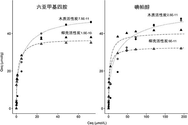 圖1:活性炭對幾種親水微污染物的吸附等溫線。