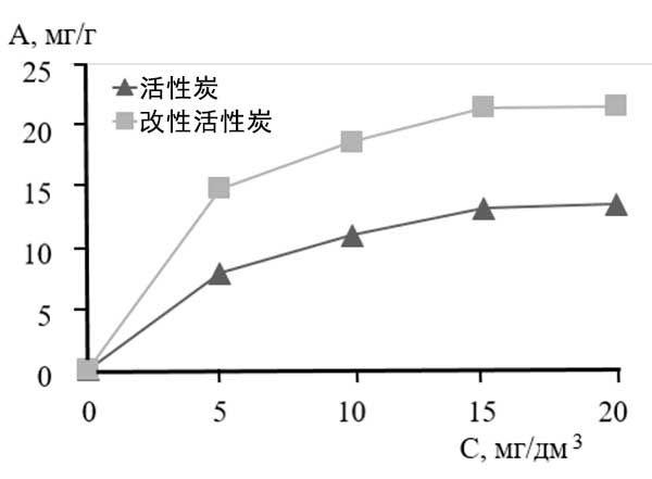 用發(fā)煙硫酸處理活性炭導致磺酸鹽基團捕獲吸附劑表面和孔內(nèi)部。用二氯乙烷對活性炭的初級處理有利于磺化劑在孔深度中的滲透,從而增強氧化,并由此促進磺酸鹽基團的形成?咨疃戎谢撬猁}基團的存在增加了吸附劑相對于汞離子的吸附能力。對于改性活性炭在靜態(tài)條件下對汞離子吸附的研究結果,根據(jù)獲得的實驗數(shù)據(jù),繪制了活性炭和改性活性炭的比較等溫線(圖1)。