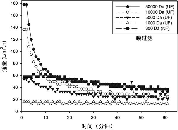 在膜過濾測試中,使用四個UF膜和一個NF膜。研究了1小時的通量變化,并監(jiān)測了降低的通量。在UF膜觀察到較高的通量降低。過濾1小時后,隨著截留分子量從50,000 Da減少到1,000 Da,通量下降也減少了。對于10,000 Da UF膜,在初始通量1小時過濾后損失了82%的通量。1,000 Da UF膜顯示出較低的通量在圖2顯示。孔徑是影響膜過濾通量的最重要參數(shù)之一,也是影響活性炭吸附能力的參數(shù)。通量也受膜結(jié)構(gòu),水中成分和廢水pH的影響。有些膜有很高的同量主要是由于膜表面與廢水成分之間的靜電相互作用。
