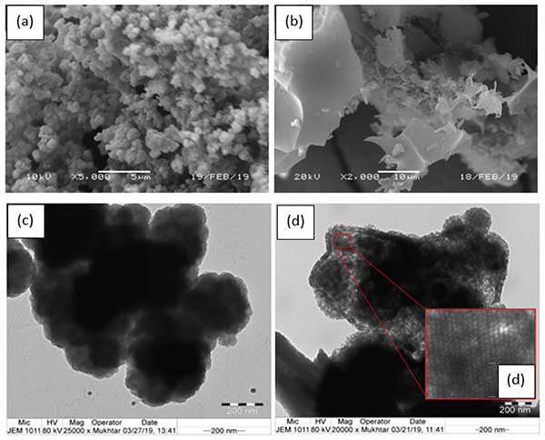 使用SEM,TEM,TGA和XRD分析活性炭的表面形態(tài),熱性質(zhì)和結(jié)晶度。用作活性炭前體的圖像(圖1a,c)顯示其典型的形態(tài)為花椰菜樣結(jié)構(gòu),這種形態(tài)似乎是由于與其中摻雜地嵌入無序聚合鏈形成的。然而,聚吡咯的球形結(jié)構(gòu)通過碳化過程被破壞,導(dǎo)致粗糙,粗糙的表面由不規(guī)則的尖角和剝離狀顆粒組成,在SEM圖像中幾乎沒有孔隙的跡象。活性炭聚吡咯的TEM圖像如圖1d所示表示觀察到均勻分布的微孔。此外,TEM圖像描繪了高度豐富和對稱的孔隙,表面積和微孔率的值對應(yīng)于該活性炭。發(fā)現(xiàn)隨著活化劑用量的增加,表面積增加,孔隙率增加。