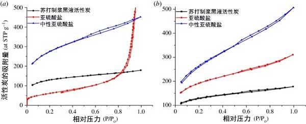 圖1顯示了活性炭在-196℃的氮?dú)馕降葴鼐和孔徑分布及其紋理特征。從看到的圖1中,活性炭的吸附等溫線在很大程度上受到制漿工藝的類型的影響。但是使用蘇打制漿黑液作為前體從活性炭獲得的等溫線遵循I型吸附等溫線;钚蕴康牡赵诜浅5偷南鄬(duì)壓力下略微增加,隨后在平臺(tái)形式中略微吸附增加,相對(duì)壓力增加至1,表明存在微孔性。但是,來(lái)自亞硫酸鹽的中性亞硫酸鹽制漿的活性炭的等溫線提供了I型和II型的吸附等溫線,這反映在碳結(jié)構(gòu)中存在一些中孔。