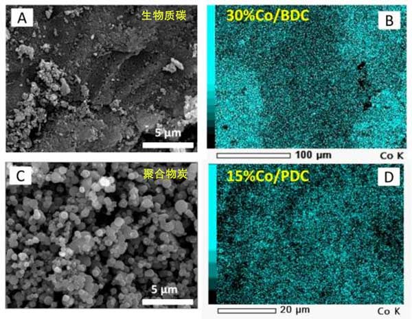 使用掃描電子顯微鏡(SEM)觀察由植物殼和酚醛樹脂的熱解獲得的活性炭的表面形態(tài),并分別在圖1A,C中示出?梢钥闯,不同的碳前體產(chǎn)生不同的表面形態(tài)。生物質(zhì)衍生的碳顯示出剛性和致密的結(jié)構(gòu),這是典型的木炭特征。而聚合物衍生的碳呈現(xiàn)具有粒子網(wǎng)絡(luò)的碳球,在球體之間產(chǎn)生大的空隙。然后將兩種活性炭用作氧化鈷的載體。為了觀察金屬氧化物在活性炭上的分散,進(jìn)行了SEM與能量色散X射線(EDX)的元素映射。圖1B,D表示裝載在兩種材料中的氧化鈷的代表。所有都顯示鈷材料(在青色中顯示)在活性炭中的均勻分散。這表明通過浸漬方法中描述的簡單化學(xué)計量計算很好地實(shí)現(xiàn)了元素鈷的目標(biāo)負(fù)載。換句話說,上述結(jié)果清楚地顯示了制備氧化鈷活性炭的成功制備步驟。