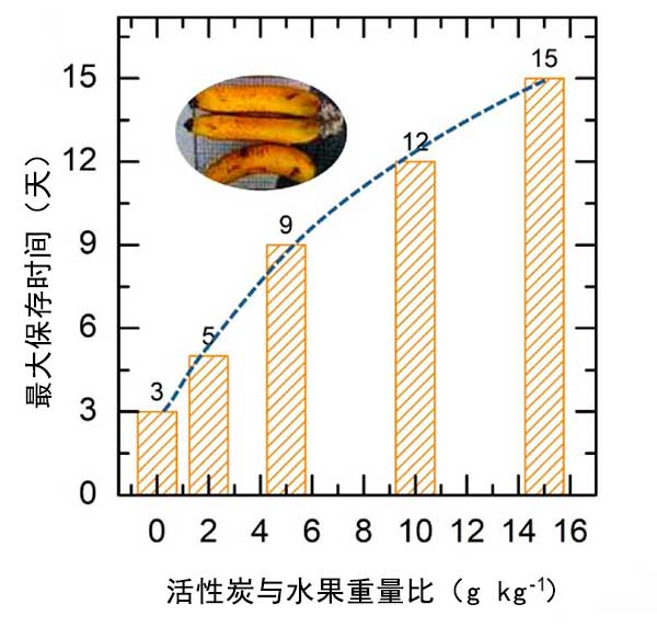 為了研究活性炭用量的影響,改變了活性炭和水果的質(zhì)量比。圖4顯示了活性炭與水果的保存時間與質(zhì)量比的范圍為。活性炭的量會影響保質(zhì)期,并且可以看到非線性相關(guān)性(見圖4中的虛線)。沒有活性炭達(dá)到存在,水果儲存時間僅為3天。根據(jù)添加的活性炭的質(zhì)量,保質(zhì)期可以從2天延長至12天。通過添加15克吸附劑用于1千克水果,可以實(shí)現(xiàn)延長高達(dá)5倍的保質(zhì)期。較高質(zhì)量的活性炭提供較長的保存時間,這可能是由乙烯吸附的活性位點(diǎn)含量較高引起的。結(jié)果表明,氧化鈷浸漬的活性炭有望用于延長水果的保質(zhì)期。