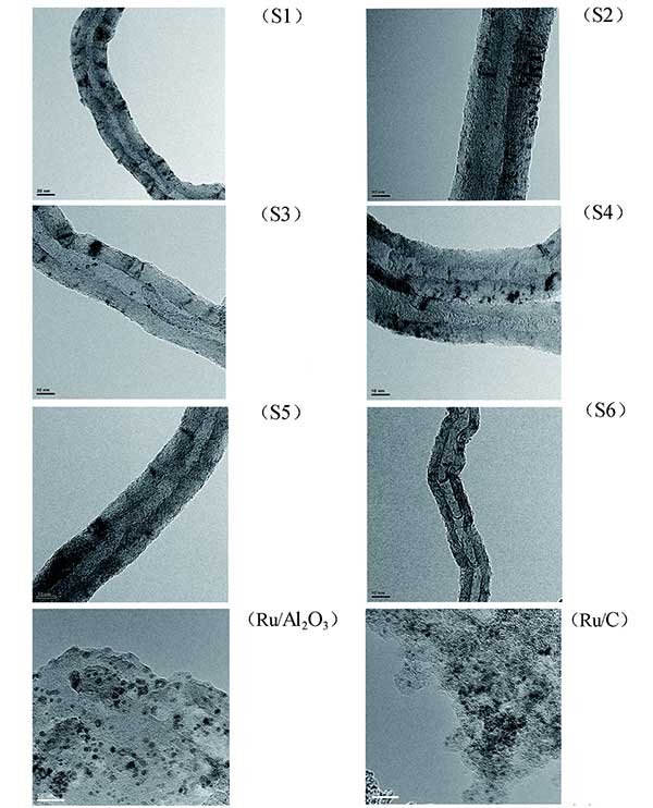 所有載釕活性炭上的釕負(fù)載量理論上為5%。通常,將活性炭加入120mL乙二醇中。并將混合物在超聲處理30分鐘以確保活性炭均勻分散。超聲處理后,在連續(xù)攪拌下滴加3.0mL RuCl 3水溶液30分鐘。然后是使用NaOH乙二醇溶液將混合物的pH調(diào)節(jié)至4.0。然后,在連續(xù)攪拌24小時后,將溶液放入微波合成反應(yīng)器中加熱100秒。過濾混合物溶液,用去離子水洗滌直至濾液的pH達(dá)到7.0,并在80℃下真空干燥。將樣品研磨成粉末使用。由于活性炭的表面是疏水的,它們傾向于在極性溶劑中聚集。并且由官能團(tuán)改性的活性炭可以提供足夠的孔隙以使釕納米顆粒均勻地分布在活性炭的表面上。在通過微波加熱的多元醇方法制備活性炭負(fù)載的釕納米顆粒。合成過程如圖1所示。