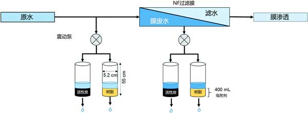 圖1:使用兩個(gè)串聯(lián)的納濾膜處理全氟烷基物質(zhì)污染的原水的示意圖,產(chǎn)生過濾水和膜廢水。另外,使用活性炭或陰離子交換樹脂處理原水和膜廢水。