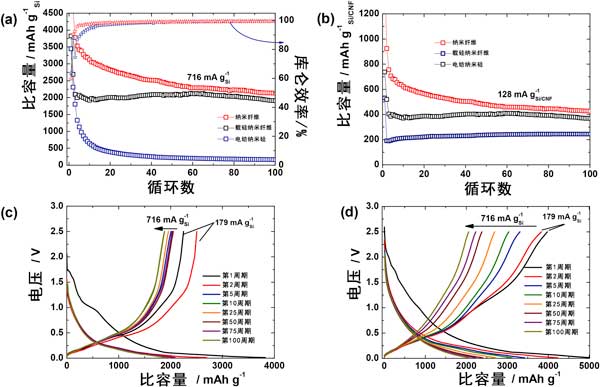 如圖4所示,從第一個(gè)循環(huán)的電壓分布中看出,兩個(gè)陽極的第一個(gè)循環(huán)的額外貢獻(xiàn)來自不可逆的固體電解質(zhì)界面層形成和電解質(zhì)分解。對(duì)于電化學(xué)表征,在紐扣電池配置中使用鋰金屬作為對(duì)電極對(duì)所有硅陽極進(jìn)行恒電流充電和放電。裸露的十億分之一硅陽極在第一個(gè)循環(huán)中提供3445mAhg的放電容量,庫侖效率約為65%。從第二個(gè)循環(huán)開始,二氧化硅的硅載納米纖維陰極的比容量值急劇下降至2600mAhg,而納米纖維的靜電紡絲陽極顯示出邊際下降,比容量為4000mAhg-1,庫侖效率均為約91%。比容量的急劇下降可歸因于二氧化硅的硅載納米纖維中的二氧化硅殼在第一次循環(huán)中不可逆鋰化。