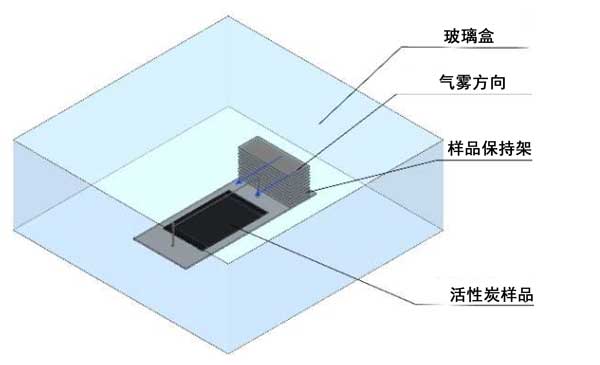 活性炭關(guān)于電場(chǎng)附增強(qiáng)吸附測(cè)試設(shè)備,由一個(gè)樣品架組成,樣品架放置在一個(gè)33厘米×33厘米×12厘米的帶有硼硅酸鹽玻璃壁的盒子內(nèi)(圖3)。風(fēng)扇(位于偏轉(zhuǎn)板后面)引起平行的空氣通量到樣品。在細(xì)的(直徑為180 µm)鎢絲電極(放電電極)上施加正電勢(shì),而相對(duì)電極(活性炭)通過(guò)兩端的兩個(gè)接地連接接地。