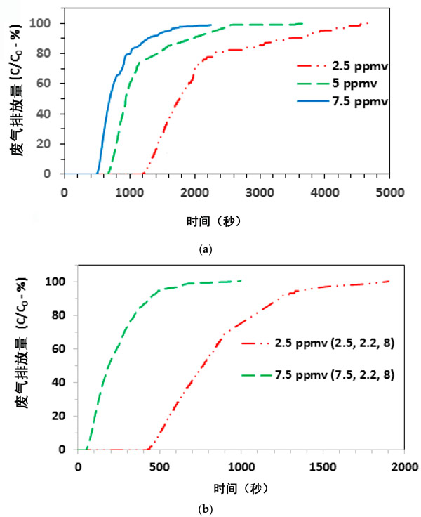 我們進行了一組實驗以評估進水氨濃度對其基于吸附的去除的影響。為此,使用6 cm和8 cm的活性炭色譜柱,在不同的進水氣態(tài)氨濃度下進行了幾次實驗。對于8 cm活性炭色譜柱,初始實驗在2.5至7.5 ppmv的氣態(tài)氨氣之間進行。分別在1.1和2.2 L/min的氣體流速下的各自發(fā)現顯示在圖2a,b中。顯然,隨著進水氨濃度的逐漸降低,突破點也向更長的時間轉移。例如,圖2中的結果a顯示以下突破趨勢:1295分鐘(2.5 ppmv)>712分鐘(5 ppmv)>532分鐘(7.5 ppmv)。此外,各個實驗的排氣時間值還顯示出在較低氣態(tài)氨濃度下的較長運行時間,即4000分鐘(2.5 ppmv)>2312分鐘(5 ppmv)>1574分鐘(7.5 ppmv)。此外,圖2中的吸附趨勢通常顯示出較寬的吸附穿透曲線,表明傳質區(qū)(MTZ)的長度相對較大。這與苯在活性炭上的吸附有所不同,后者表現出明顯的穿透曲線。對于氨而言,這種不同的趨勢可能歸因于可以與表面酸性基團相互作用的氨部分的基本性質。進入的氣態(tài)氨的增加及其從整體氣相到GAC表面的轉移將啟動GAC表面吸附位點(包括孔中的那些位點)更快的消耗。由于各自的表面吸附位點是固定的和有限的,因此預計在較高的進水氨濃度下,較早的突破以及較早的耗盡將逐漸發(fā)生。