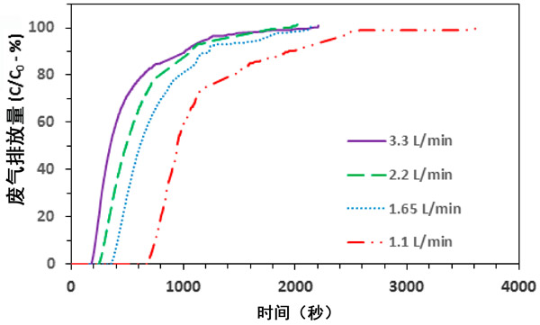 本研究還使用基于數據坑的活性炭研究了氣體流速對氨吸附的影響。圖3提供了1.1至3.3 L/min的氣體流速的相應結果。通常,氨氣流量的逐漸增加也會導致相應的穿透時間和排氣時間響應逐漸減少(圖3)。例如,流量為1.1、1.65、2.2和3.3 L/min時的突破時間分別為712、383、272和197 min(圖3)。因此,較高的突破時間值在較低的氨氣流速下蒸發(fā)。此外,對于1.1、1.65、2.2和3.3 L/min流量研究,還分別記錄了2312、1673、1315和1213分鐘的排氣時間。這類似于上述突破時間趨勢,可以解釋如下。在較低的流入氣體流速下,氨分子從氣相到活性炭表面的傳質速率也相對較小。因此,與較高氣體流速下的活性炭表面部位相比,單位時間內所占據的活性炭表面部位也更少,產生更高的穿透時間和耗竭時間響應(圖3)。這些發(fā)現對于實際應用尤其重要。