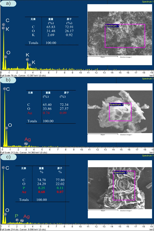 圖1:活性炭(a)和載銀活性炭的EDS光譜在(b)之前和之后磷酸鹽吸附(c)。