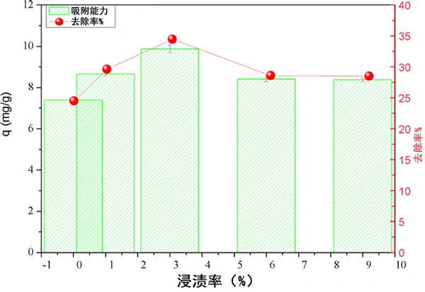 為了評(píng)估各種浸漬率對(duì)改性活性炭的磷酸鹽吸附能力的影響,在不同的納米銀顆粒/活性炭質(zhì)量比(1%,3.0%,6.0%和9.0%)下,以原始活性炭和負(fù)載納米銀顆粒的活性炭進(jìn)行了初步實(shí)驗(yàn)。 。在這項(xiàng)研究中,實(shí)驗(yàn)是在25±2°C的溫度下,初始磷酸鹽濃度為30 mg/L,吸附時(shí)間為60分鐘,吸附劑量為1.2 g / L進(jìn)行的。