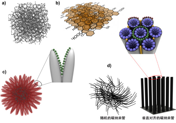 圖1:不同吸附劑的示意圖:a)活性炭,b)氧化石墨烯,c)碳納米角,d)碳納米管。