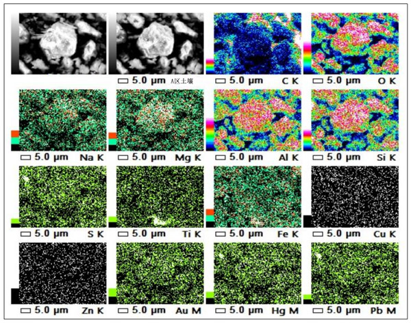 SEM-EDS測(cè)試使用了三個(gè)樣本,即A區(qū)域樣本,B區(qū)域樣本和原始土壤樣本。分析了這三個(gè)樣品。尋找的參數(shù)是充當(dāng)污染物的重金屬元素。該測(cè)試的結(jié)果顯示了土壤中存在的元素的質(zhì)量百分比。掃描電鏡是一種用于表面觀察的工具,其焦點(diǎn)深度大于光學(xué)顯微鏡,可以直接觀察復(fù)雜的表面而無需復(fù)制。SEM圖像顯示出樣品的形態(tài)狀態(tài),顯示出大小不規(guī)則的團(tuán)塊。同時(shí),EDS分析非常適合揭示樣品中的化學(xué)元素和化合物。EDS的元素映射將為對(duì)象表面上的每個(gè)元素賦予不同的顏色,并定量分析每個(gè)元素的百分比。