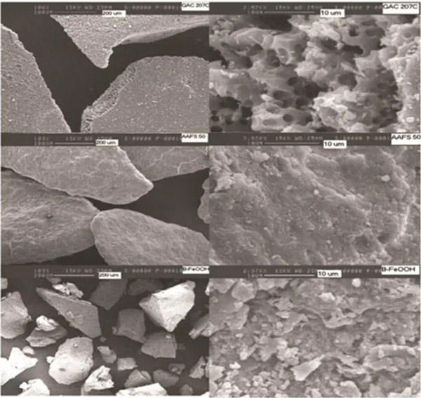 圖2顯示了吸附劑的SEM圖像;钚蕴烤Я5乃毫堰吘壱诧@示出內(nèi)部“孔”。其內(nèi)部結(jié)構(gòu)可以被認(rèn)為是碳板的石墨型分層;罨^程中產(chǎn)生的孔隙和大量碎屑導(dǎo)致了這種吸附劑的易碎性。AAFS晶粒顯示出相同的傾斜形狀,表面看起來光滑且具有均勻的涂層。在更大的范圍內(nèi),僅可見很少的裂縫或孔洞,這表明表面積主要在外部。β-FeOOH的表面具有高脆性,因此表面光滑且?guī)в写罅克樾。多孔結(jié)構(gòu)與SEM照片非常吻合(圖2),說明了活性炭的片狀結(jié)構(gòu)及其眾多的空洞,而鐵化合物則顯得光滑,只有很少的裂紋;罨^程中產(chǎn)生的孔隙和大量碎屑導(dǎo)致了這種吸附劑的易碎性?紤]規(guī)模,中孔和大孔上看到照片(尺寸以上2.5 μ M)。β-FeOOH的表面易碎,因此表面光滑,帶有大量碎屑。該刻度不允許人們區(qū)分赤霞石微晶(FeOOH的β形式)的特征桿雪茄形狀。