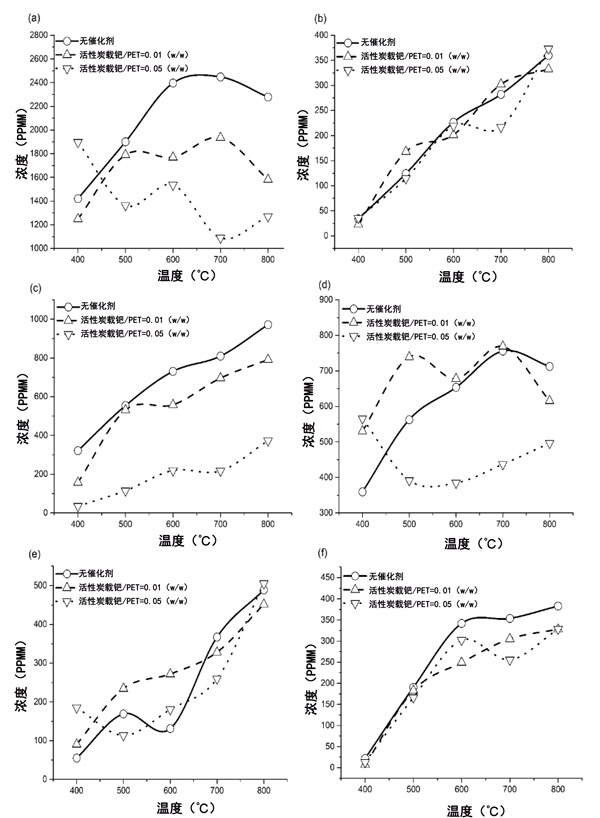 圖2:在有和沒有活性炭載鈀催化劑的條件下,聚對(duì)苯二甲酸乙二酯熱解過(guò)程中總胺衍生物的濃度隨溫度的變化。