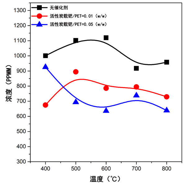 活性炭載鈀催化劑的高表面積歸因于活性炭載體。盡管金屬負(fù)載量為5 wt%,高表面積仍可實(shí)現(xiàn)高鈀分散度(42%)。已知活性炭具有很高的熱穩(wěn)定性,因此在熱解過(guò)程中大部分保留了活性炭的孔隙率。圖1顯示了在有和沒有鈀催化劑的情況下,由PET熱解獲得的多環(huán)烴和聯(lián)苯衍生物的濃度比較。使用不同的活性炭載鈀催化劑/PET比確定熱解過(guò)程中催化劑的作用。隨著熱解溫度的升高,三種類型的多環(huán)烴(2-萘甲酸,芴酮和三亞苯基)的濃度增加,這是因?yàn)榄h(huán)化反應(yīng)在較高溫度下更有利地形成了苯環(huán)。