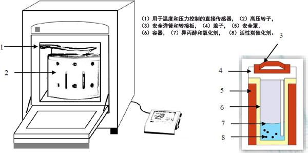 圖1是實驗室設(shè)置的示意圖。微波消解實驗站用于產(chǎn)生微波能量。在標(biāo)準(zhǔn)反應(yīng)運行中,將10 mL異丙醇溶液轉(zhuǎn)移到100 mL鐵氟龍容器中。在攪拌下將所需體積的過氧化氫溶液(30%)注入到容器中。然后,將一定量的活性炭催化劑添加到該異丙醇溶液中,并在微波消解實驗室站中照射120秒。在所有實驗中,溶液溫度均保持在80±2°C,MW功率保持在600W。