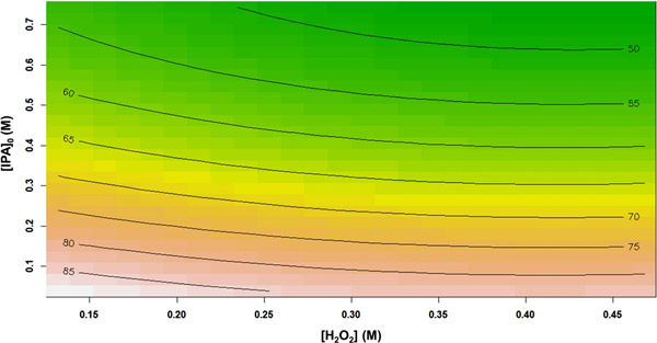 圖2顯示了總有機碳去除效率百分?jǐn)?shù)與H 2 O 2濃度和初始異丙醇濃度的關(guān)系。從響應(yīng)輪廓中可以看出,將異丙醇初始濃度從0.038 M增加到0.743 M,導(dǎo)致TOC去除率從85.17%急劇降低到46.29%?赡苁且驗樵谙嗤膽(yīng)用反應(yīng)條件下,自由基(OH•)的數(shù)量保持恒定,而初始異丙醇濃度卻增加了。換句話說,相對較少量的氧化基團(tuán)可用于攻擊異丙醇分子。類似地,總有機碳降解性能也隨著H 2 O 2濃度的增加而逐漸降低。過量的H 2 O 2可能促進(jìn)自動清除反應(yīng)的發(fā)生。