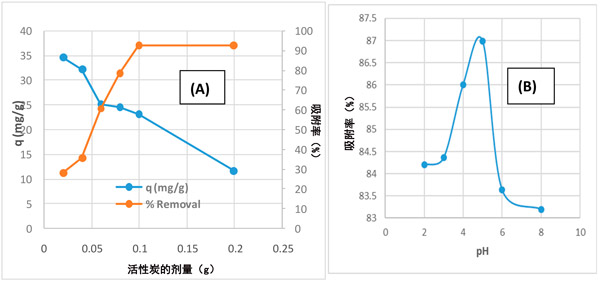 我們研究了不同參數(shù)對(duì)活性炭去除乙酰胺的影響,例如吸附劑的劑量,pH,乙酰胺的初始濃度和接觸時(shí)間。吸附劑的用量是吸附過(guò)程中的重要參數(shù),因?yàn)樗鼪Q定了系統(tǒng)中吸附劑與被吸附物的平衡以及給定濃度下吸附劑的容量。吸附劑劑量對(duì)由活性炭去除啶蟲(chóng)脒的效果在不同的吸附劑的劑量從0.02-0.2克/100毫升變化進(jìn)行了研究,如圖1。隨著活性炭吸附劑劑量的增加,對(duì)乙酰胺的去除百分率從27.8%增加到92.5%。這可以歸因于活動(dòng)站點(diǎn)數(shù)量的增加。在較高的吸附劑量下,由于聚集體的形成,吸附位點(diǎn)的使用不完全。與去除百分率相反,隨著吸附劑劑量的增加,活性炭對(duì)乙酰胺的吸附能力下降了一些。注意到在0.1g的吸附劑劑量之后,吸附效率沒(méi)有顯示出顯著的增加,這表明了吸附位點(diǎn)的飽和。對(duì)于通過(guò)活性炭去除乙酰胺實(shí)驗(yàn)而言,0.1 g的吸附劑量似乎是合適的。