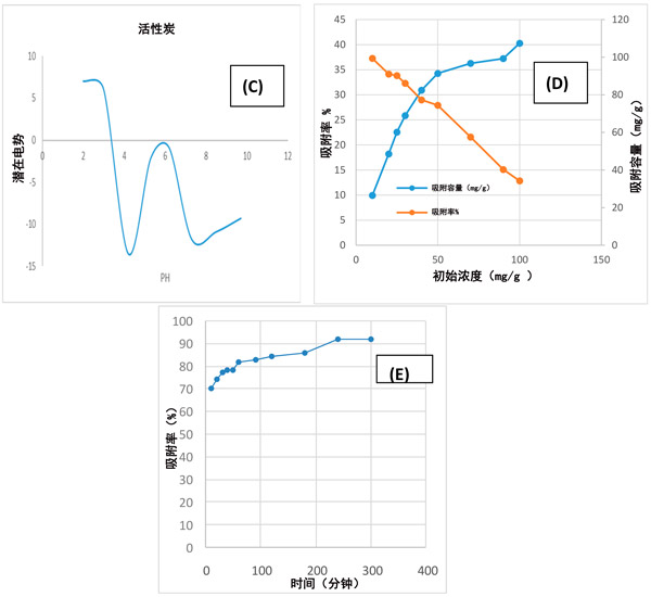 圖1:(A)吸附劑劑量的影響;(B)pH;(C)活性炭的電勢(shì);(D)乙酰胺的初始濃度;(E)通過(guò)活性炭除去乙酰胺的接觸時(shí)間。