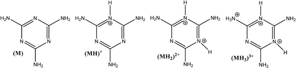 優(yōu)化了活性炭的用量和三聚氰胺溶液濃度范圍的影響,以實現(xiàn)定量分析吸附前后,以及這些研究中使用的所有活性炭中三聚氰胺的最佳條件。最初的實驗涉及不同的吸附劑劑量,以及用于吸附物檢測和定量的多種方法。通過考慮三聚氰胺在水中的溶解度(酸性和堿性條件)以及吸附實驗前后溶液中的可測量水平來選擇三聚氰胺溶液的濃度范圍。由于三聚氰胺(M)是堿,因此它可以在水溶液中經(jīng)歷幾次酸/堿平衡反應并形成不同的質子化物質(見圖1)。