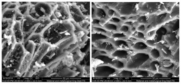 通常,由碳化過程形成的活性炭具有粗糙的表面結(jié)構(gòu),其孔徑不會(huì)太大以至于會(huì)影響吸附能力(圖1)。粒度和表面積對吸附劑很重要,因?yàn)榱6葧?huì)影響吸附能力。由該圖可知,通過RSS碳化處理得到的活性炭的孔徑為40μm左右,未改性,使用活化液進(jìn)行改性后,為<20μm。這表明,活化液的浸漬在孔的形成中起著重要的作用。促進(jìn)更多的孔隙形成。總表面積影響總吸附容量,從而提高吸附劑去除廢水中有機(jī)化合物的效率。