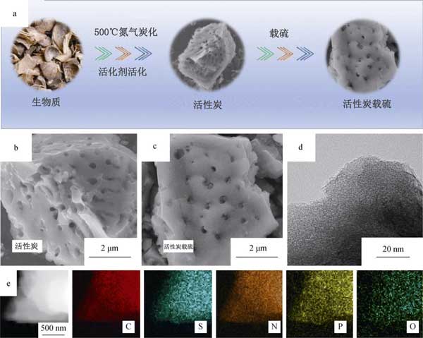 首先,除去生物質(zhì)的污垢和表面雜質(zhì),用清水徹底清洗活性炭原材料,然后用蒸餾水反復(fù)清洗,然后將它們粉碎成碎片,然后在烤箱中100°C下干燥。為了進(jìn)行預(yù)碳化,將干燥的生物質(zhì)在氮?dú)夥障碌恼婵展苁綘t中在500°C的溫度下熱解2小時(shí),以去除少量有機(jī)分子。隨后,為了通過(guò)化學(xué)活化提高比表面積,將預(yù)碳酸化的生物質(zhì)以1:4的重量比浸入作為化學(xué)活化劑的水溶液中,然后充分?jǐn)嚢?小時(shí)以確保完全滲透。之后,將混合物在N 2下于900°C退火1小時(shí)。最后,用鹽酸反復(fù)洗滌退火后的樣品,然后用過(guò)量的蒸餾水沖洗以獲得中性pH。最終樣品通過(guò)在80°C的空氣中干燥獲得,并標(biāo)記為多孔活性炭。相比之下,使用相同步驟制備的未添加活化劑的產(chǎn)品被標(biāo)記為無(wú)孔活性炭。接著使用這兩種活性炭升級(jí)成加硫復(fù)合材料,將升華后的硫(純度>99.95%)和相應(yīng)的活性炭粉末(重量比為60:40)充分混合并在研缽中研磨。然后,將獲得的混合物用特氟隆容器密封在高壓釜中。在155°C下熱處理12小時(shí)后,獲得了多孔摻硫活性炭和無(wú)孔摻硫活性炭復(fù)合材料。