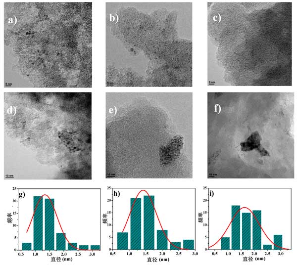 活性炭載釕催化劑獲得的TEM圖像如下。必須提到的是,盡管通常觀察到分散良好的釕納米顆粒(圖1 a–c),但也發(fā)現(xiàn)了一些顆粒團聚(圖1d–f),特別是在使用最氧化的活性炭載體。顆粒大小分布已在圖1g–i中以條形圖繪制,分別為幾種不同活化后的活性炭載體制成的催化劑平均顆粒大小分別為1.3、1.4和1.6 nm。一般而言,TEM數(shù)據(jù)表明,所用的浸漬方法成功地在活性炭材料上形成了小的釕納米顆粒(平均尺寸小于2 nm),并且似乎隨著載體的氧化,其粒徑略有增加。這可以涉及到的釕前體的氧官能團的錨固,和它們的部分分解的還原熱處理期間的效果,這可能導(dǎo)致一些金屬燒結(jié)。
