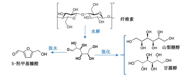 從纖維素中所示產(chǎn)物的反應(yīng)途徑的簡化方案在圖2展示。在空白試驗(無催化劑)中,纖維素轉(zhuǎn)化率為35%,并且形成了少量的葡萄糖和羥甲基糠醛。在用活性炭負載的釕催化劑進行的測試中,與空白實驗相比,纖維素轉(zhuǎn)化率顯著提高,并且山梨糖醇收率很高。這些數(shù)據(jù)中的實驗誤差低于5%。