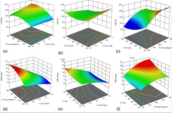 圖1:3-D圖顯示了(a、d)溫度和濃度(b、e)接觸時(shí)間以及濃度(c、f)接觸時(shí)間和溫度的相互作用對(duì)活性炭的百分收率和亞甲基藍(lán)數(shù)的影響。