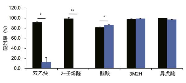 圖2: 活性炭和氧化鋅對異味揮發(fā)性有機化合物的吸附能力。黑色和藍色條分別表示活性炭和氧化鋅。