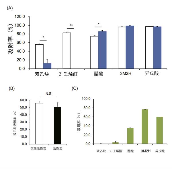 圖3:活性炭對產(chǎn)生異味的揮發(fā)性有機化合物的吸附能力。(A)改性活性炭和氧化鋅的吸附水平。(B)使用相同含量的活性炭和改性活性炭,比較改性活性炭和活性炭的二乙酰基吸附水平。(C)二氧化鈦對各種VOC的吸附水平。